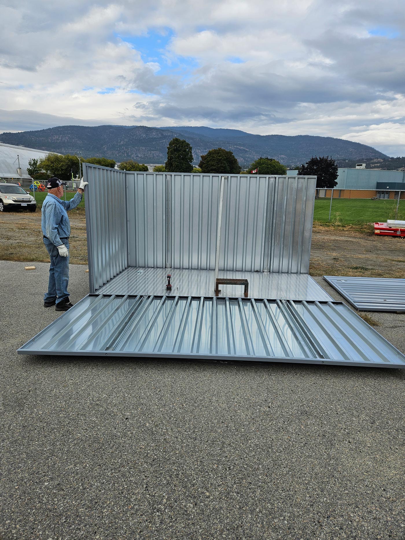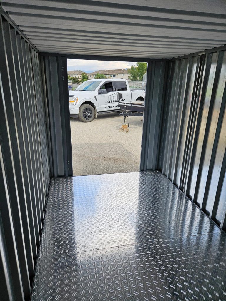 The Flat Pack Container is made from 20 gauge galvanized steel, is strong, weatherproof and joints are rust-free. It sits above the ground on forklift skids keeping the floor free from moisture. The OSB strand board flooring is standard with the Flat Pack Container and is treated for moisture and insects.
